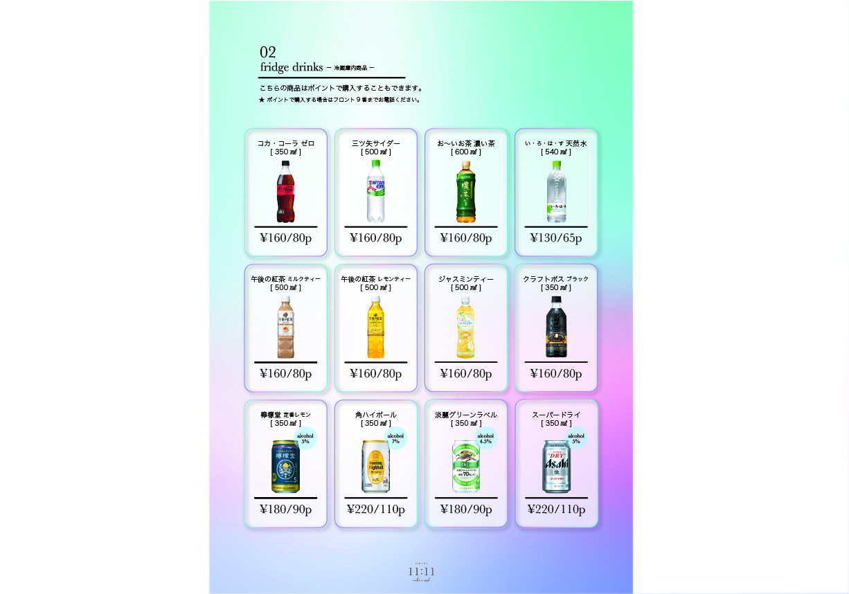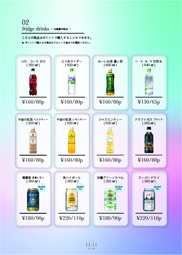 ※セルフサービス商品につき申し訳ありませんが、フロントから客室へのお届けは行なっておりません